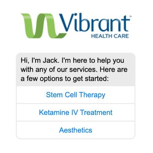 Vibrant Health Care recently used Botco.ai to author and train its web-based chat experience. This premier regenerative medicine practice is located in Scottsdale, Arizona. The virtual assistant offers options that include scheduling a consultation, attending an event, and/or watching a webinar, ultimately allowing health care providers to stay connected to their patients while streamlining processes and improving profitability through CRM. The option of adding a chat experience to an existing website gives users the option to immediately connect to an AI agent or allows them to scroll the website, take their time and reach out when they need help. Named ‘Jack’, Vibrant Health Care’s chat experience offers three initial paths of conversation that ultimately lead their users to select from three choices of conversion.